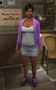 Donna is a woman with short hair and dark skin. She wears a purple zipper over a white low-neck top. Around her neck, she wears a golden crucifix chain and she also wears golden hoops as earrings. Her outfit is completed with a short denim skirt and black shoes with purple laces that match her zipper. In other shops, she is also seen wearing a white t-shirt that says “Death Before Dishonor” and she also has a different hair style and hair color at times.