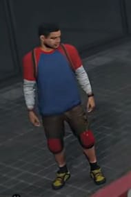 Felipe is a young boy with black hair and an army haircut. He wears a red blue and white sweatshirt with brown cargo shorts and red knee pads. He also has a watch on his left wrist and wears black and yellow shoes and a backpack that could possibly be a parachute.