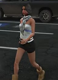 Keyla is a slim woman with dark brown hair. She wears a white scarf around her neck and a white strapless top with black shorts. She also wears brown boots and a white belt.