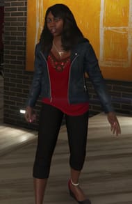 Tanisha is seen in the mission Lamar Down wearing a red top over which is a leather jacket. She wears black three-fourth trousers and black and red heels with a white anklet around her left ankle. She has black hair that is normally left open and also wears a chain with a triangular pendant around her neck.