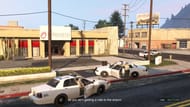 The trio leave the bank through the main entrance where a few police cruisers are waiting for them. Trevor can take out the cops and their vehicles with his minigun while Michael and the gunman assist him. They start their journey on foot and hold off the cops until Franklin comes to their rescue.
