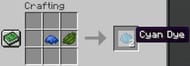 The cyan dye is in the same boat as the lime green and gray dyes, it requires the player to combine the green and blue dye colors. There are no plants, items, or flowers that can be used to obtain cyan dye directly. By placing a single unit of green and blue dye anywhere on the crafting grid you will receive 2 units of cyan dye.