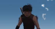 Makanami Senka shares similarities with his brothers in terms of appearance, sporting blue hair and wearing a striped light blue Kirigakure uniform, complete with a sword attached to his back.