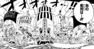 The Battle Franky is a group of unique battleships that Franky built, each with the designation "Battle Franky" and a call number ranging from 1 to 35. Each is fully armed with cannons and other weapons despite being no larger than a lifeboat. Some ships have turrets, armor, and other mechanical gadgets. Because of this, these tiny vessels are just as lethal as real battleships.