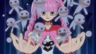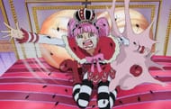 The two-year time skip has given Perona a more mature appearance than before. She is sporting a long, strapless black dress with lavender frills, red high-heeled boots, and a large, black top hat decorated with white flowers. She wears pink nail paint on her fingernails and has a pink bat tattoo on her left bicep. She also wears a watch on her left wrist. She still carries a replica of Kumashi in a plush animal and her trademark parasol. She now has several spiral braids in her hair on the back of her head.