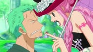 She was startled to see Zoro on Kuraigana Island, but she chose to tend to his wounds because he was the only other person there. The two argued at first, but after living on the island with Dracule Mihawk for two years, they came to trust each other. In addition, she voluntarily returned Zoro to the Sabaody Archipelago. She later fought the Marines' advances so the Straw Hats might flee.