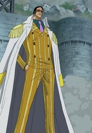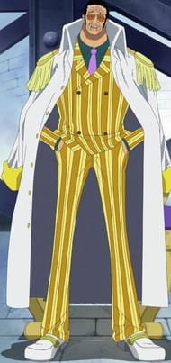 Kizaru is really tall and slim. He is a middle aged man with some wrinkles on his face, short curly black hair and a thin beard. He is older than Aokiji and Akainu. Kizaru wears a yellow-striped suit with a Marine coat draped on his shoulder like a cape, with pure white shoes with gold-amber tinted sunglasses. He wore a dark green shirt with a mauve tie under his suit. He has a black Den Den Munshi on his left wrist like a wristwatch and has a relaxed grin on his face.
