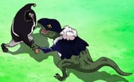 He also acquires advantageous physical traits, such as teeth that are very hard and sharp and jaws that are strong enough to rip through a Pacifista's stronger-than-steel body and cause it to bleed. His enormous reptilian tail, which can hit people with incredible force, is also a powerful weapon. He also develops razor-sharp claws on his feet, which improve his kicks.